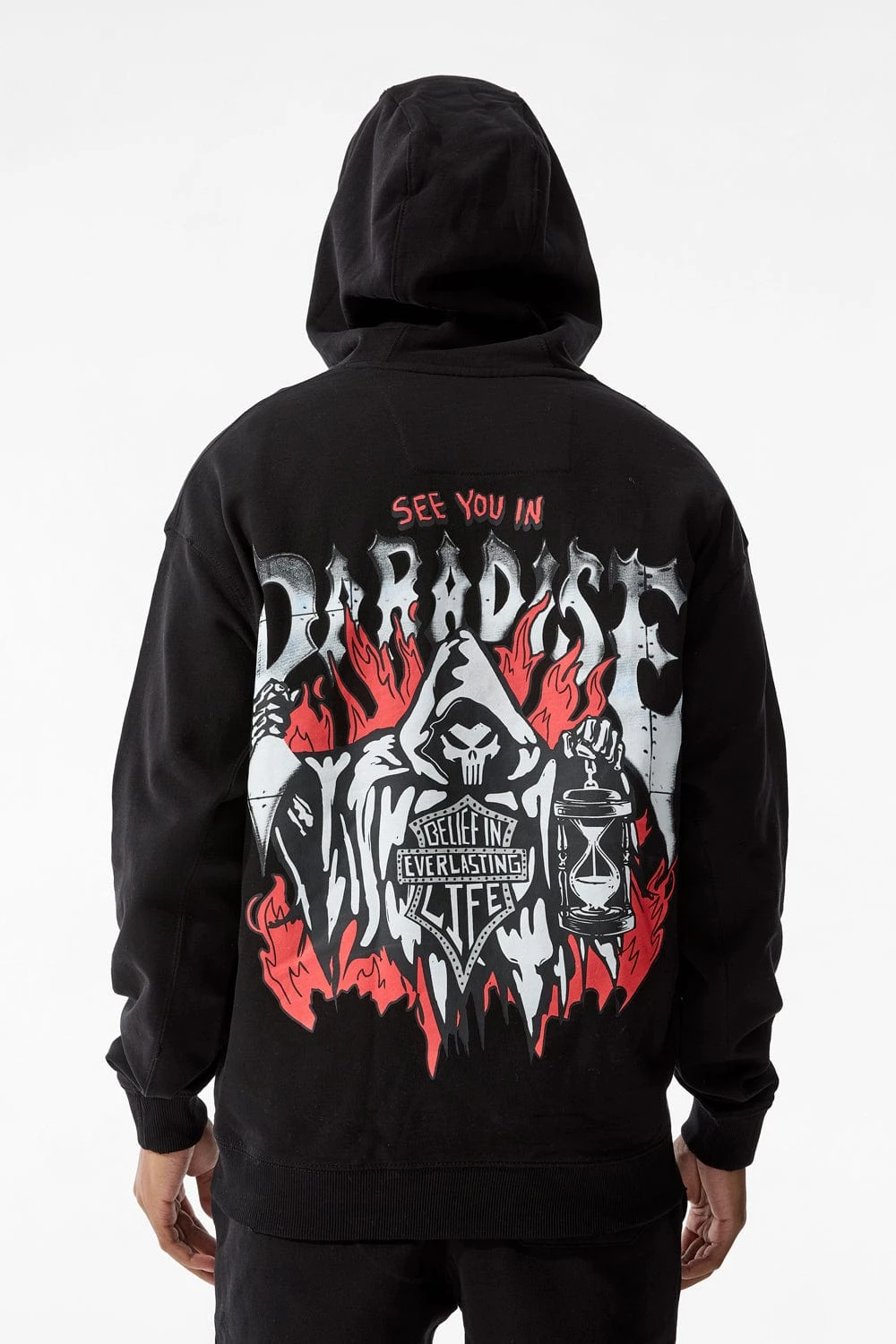 *Cozy is 6’1″ and weighs 170 lbs. He is wearing our Afterlife Pullover Hoodie (Size Large) in Noir