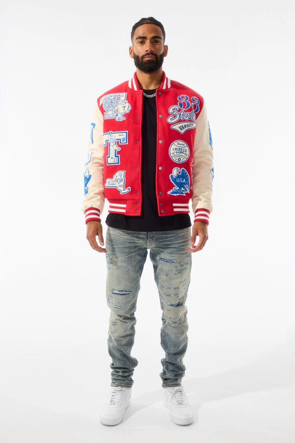 *Shomari is 6’1″ and weighs 175 lbs. He is wearing our All American Varsity Jacket (Size Large) in Red