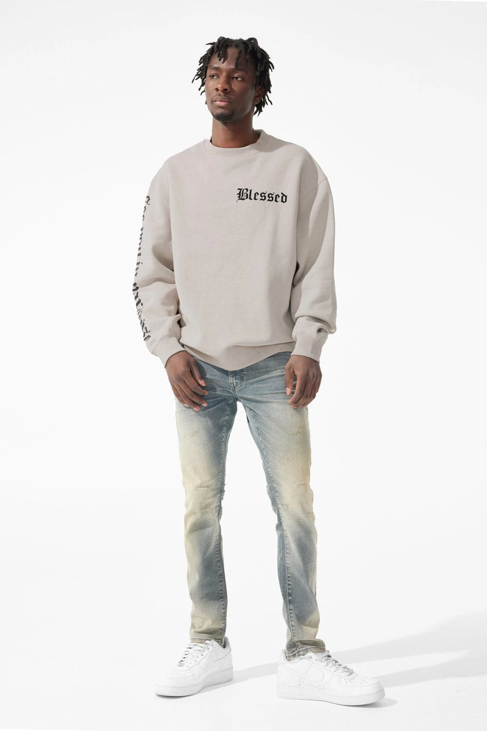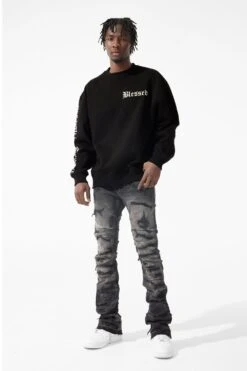 *Khadim is 6’1″ and weighs 170 lbs. He is wearing our Blessed Crewneck Sweatshirt (Size Large) in Black