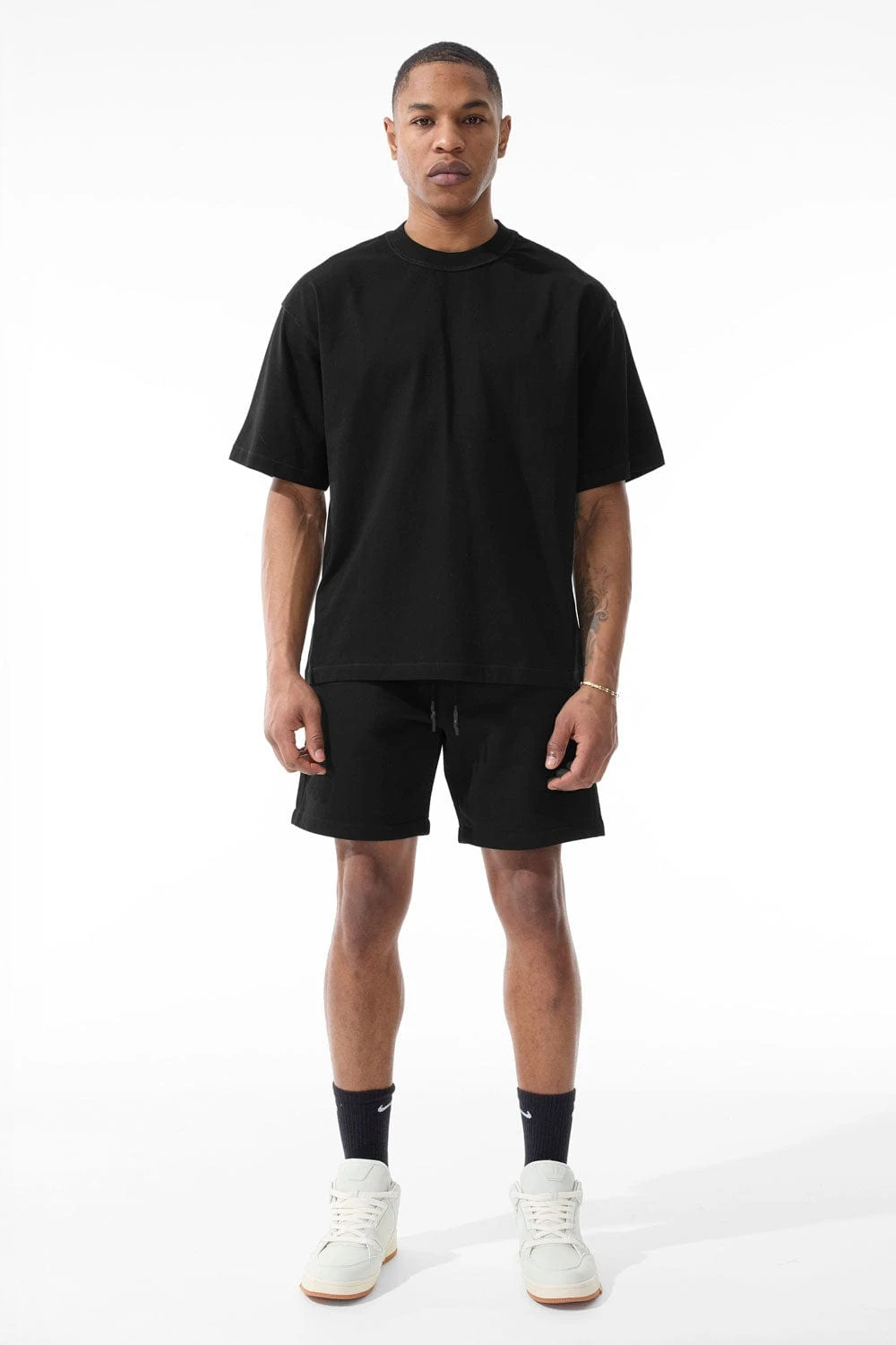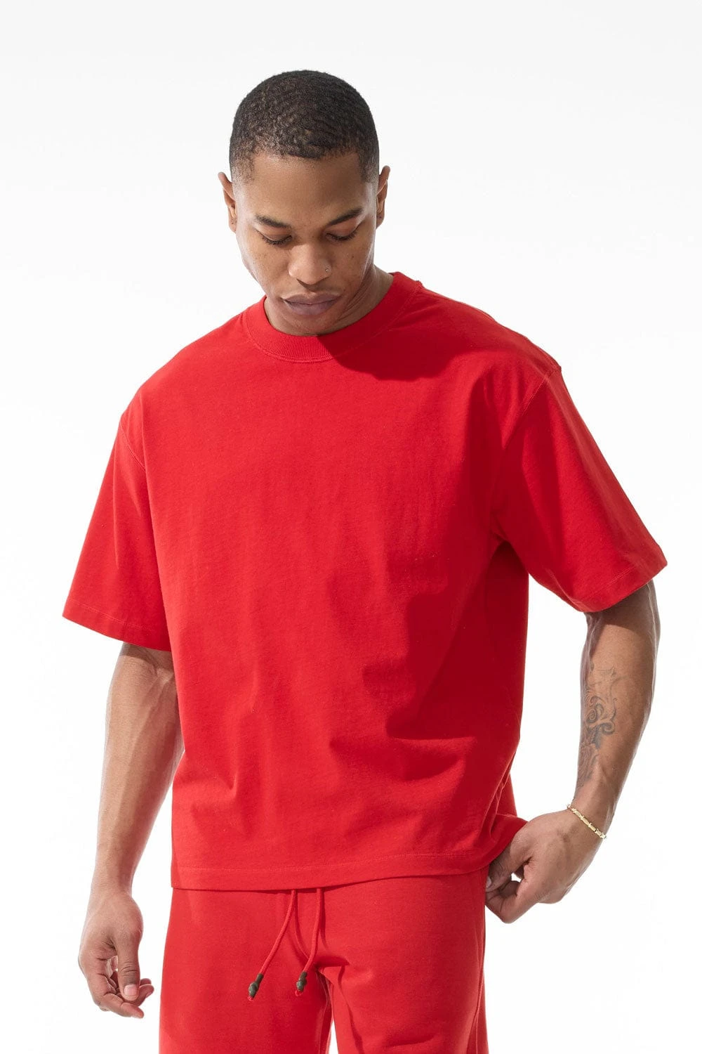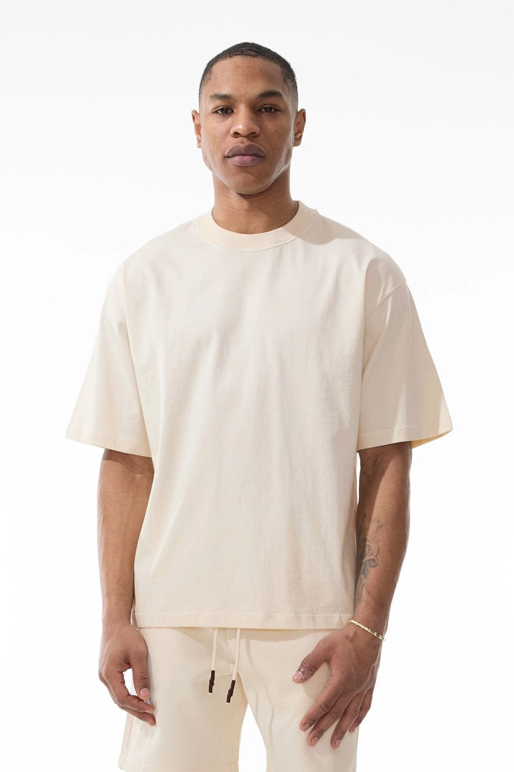 *Damaris is 6’1″ and weighs 180 lbs. He is wearing our Burbank Cropped Boxy T-Shirt (Size Large)