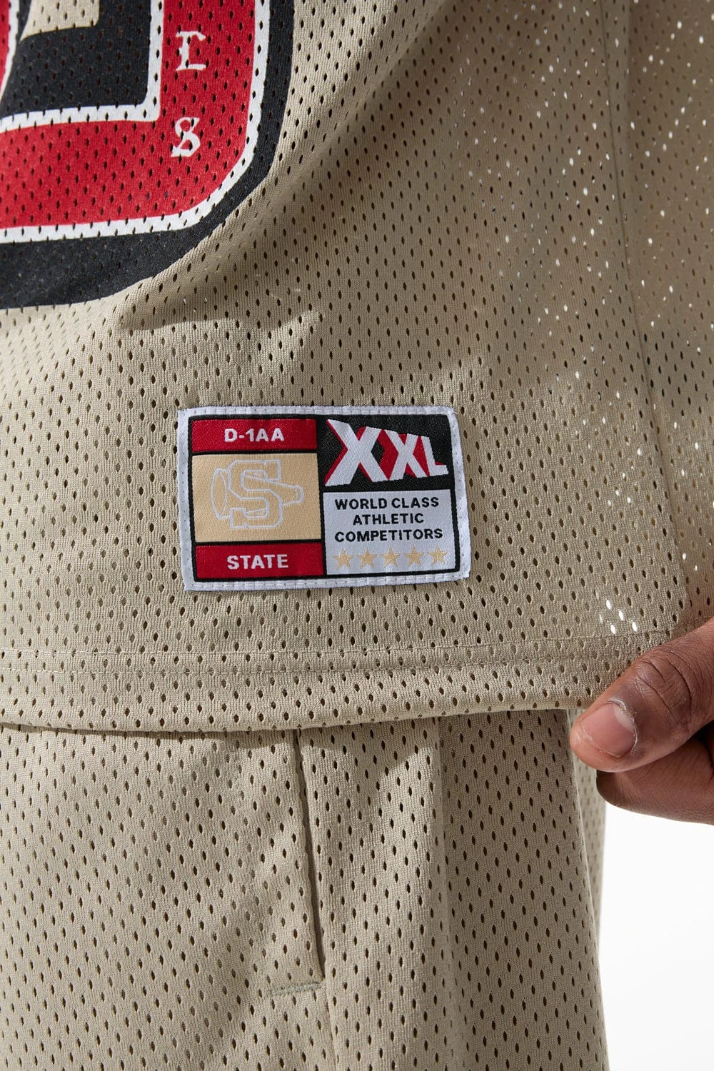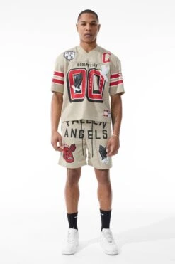*Damaris is 6’1″ and weighs 180 lbs. He is wearing our Fallen Angels Football Jersey (Size Large) in Khaki