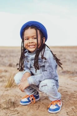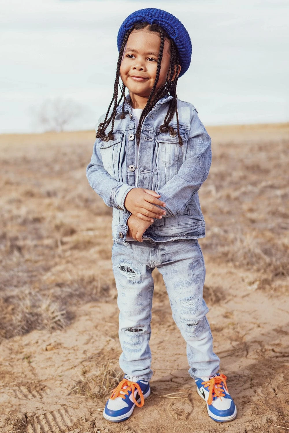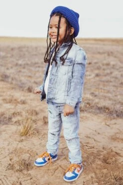 *Harlemย is 3’6 and weighs 37 lbs. He is wearing our Kids Bayside Denim Trucker Jacket (Size 4T)ย in Sky Blue, paired with ourย Kids Bayside Denimย (Size 4T) in Sky Blue