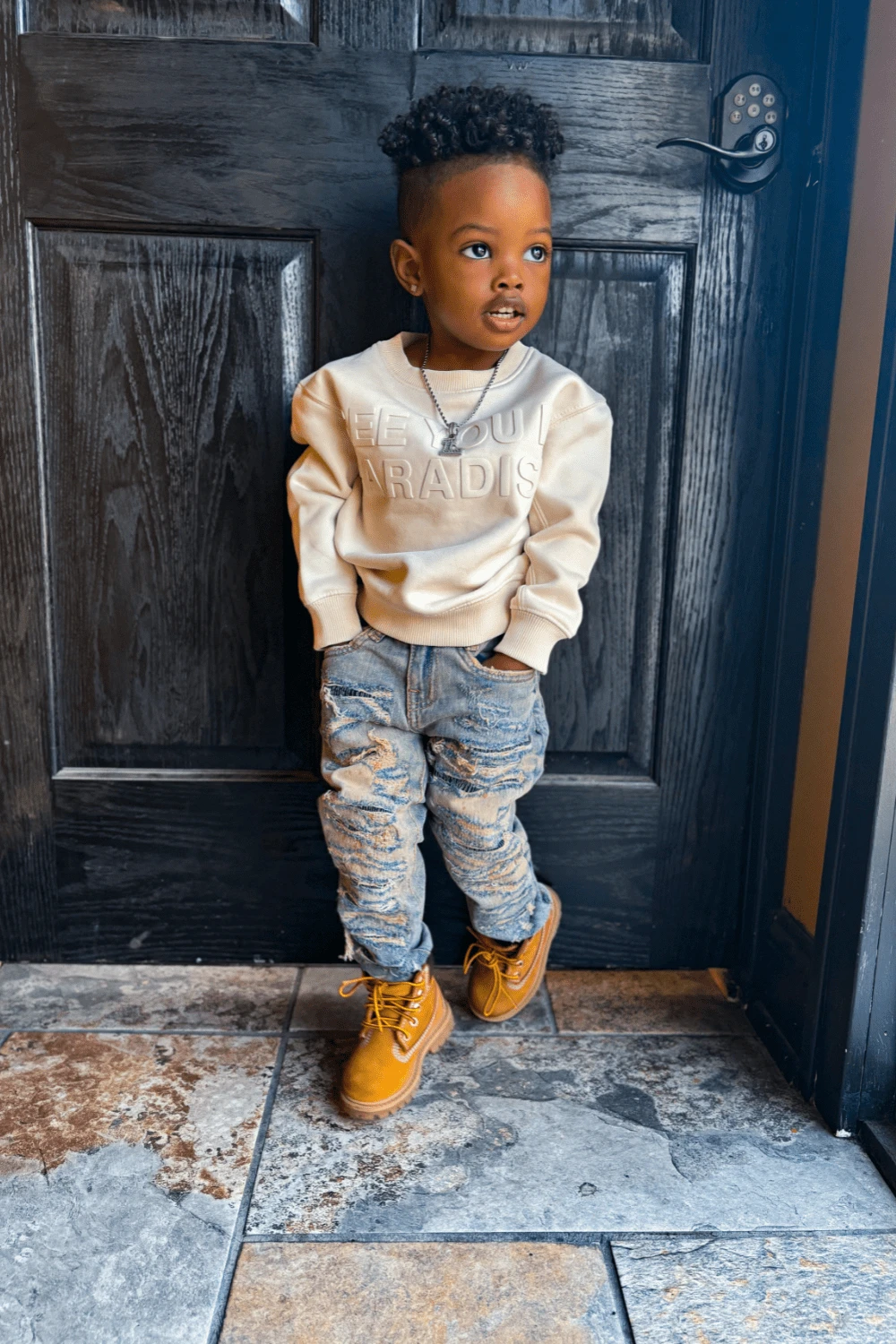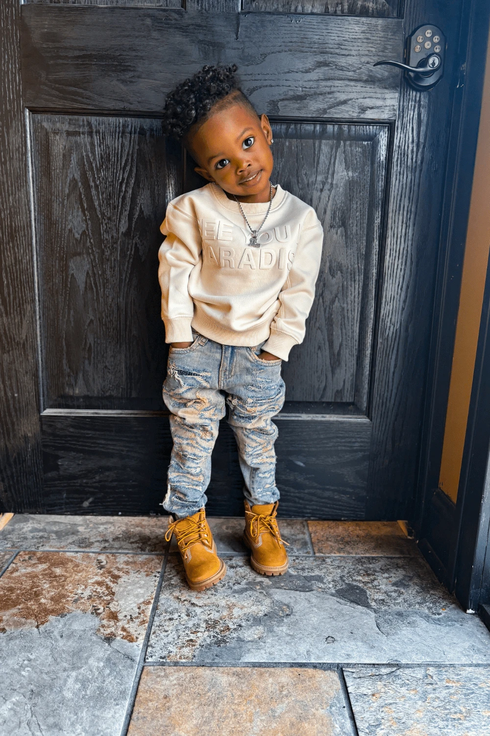 Lathan is wearing our Kids Gladiator Denim (Antique) in size 2T. Lathan is 2 years old.