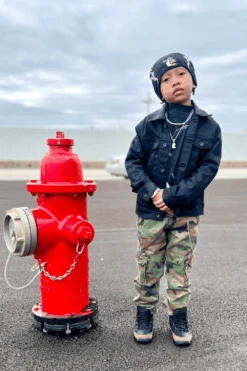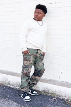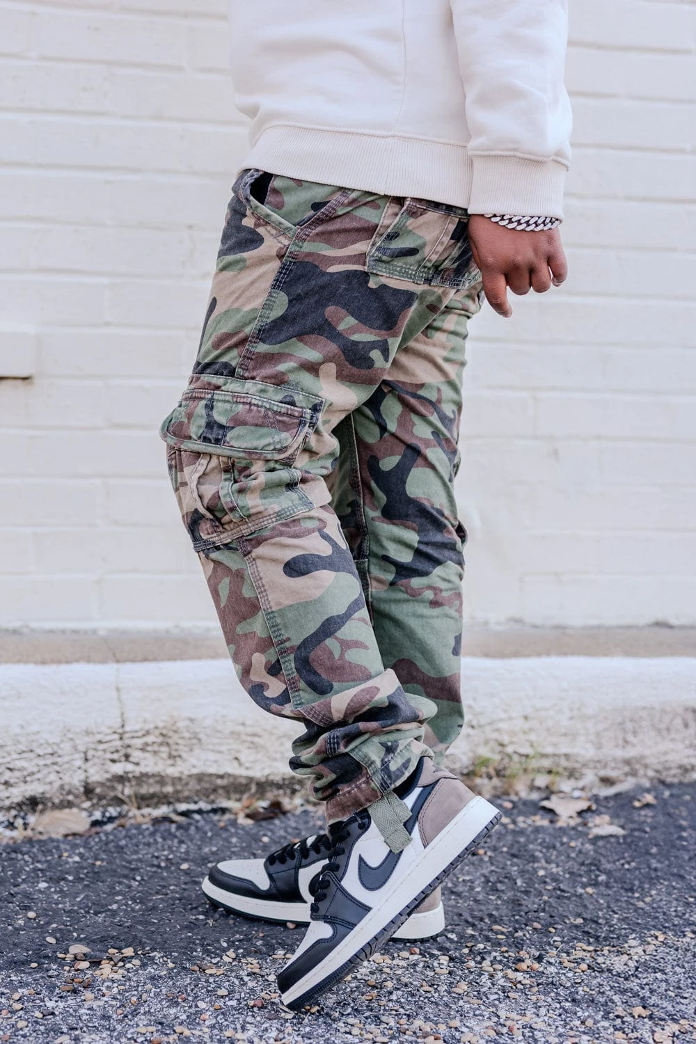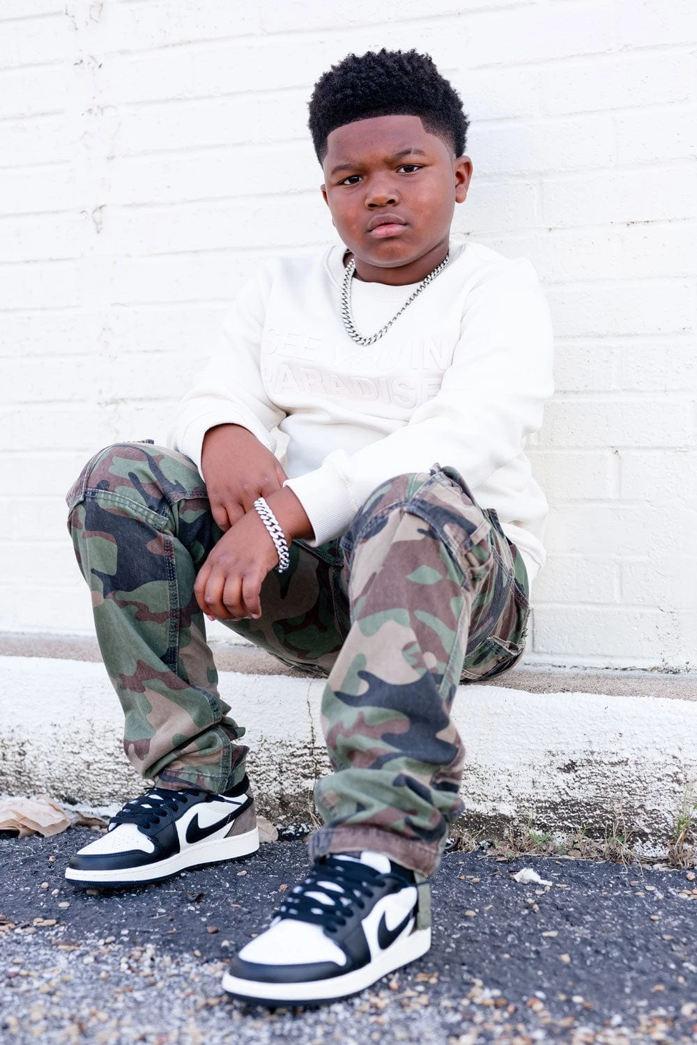 *Kade is wearing our Kids OG Camo Cargo Pants (Vintage Camo) in size 6.