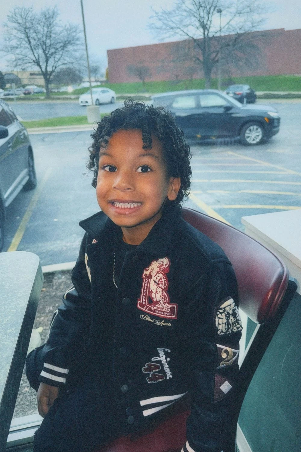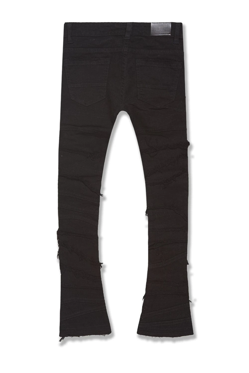 Braeden is wearing our Kids Stacked Elm Street Denim (Jet Black) in size 5.