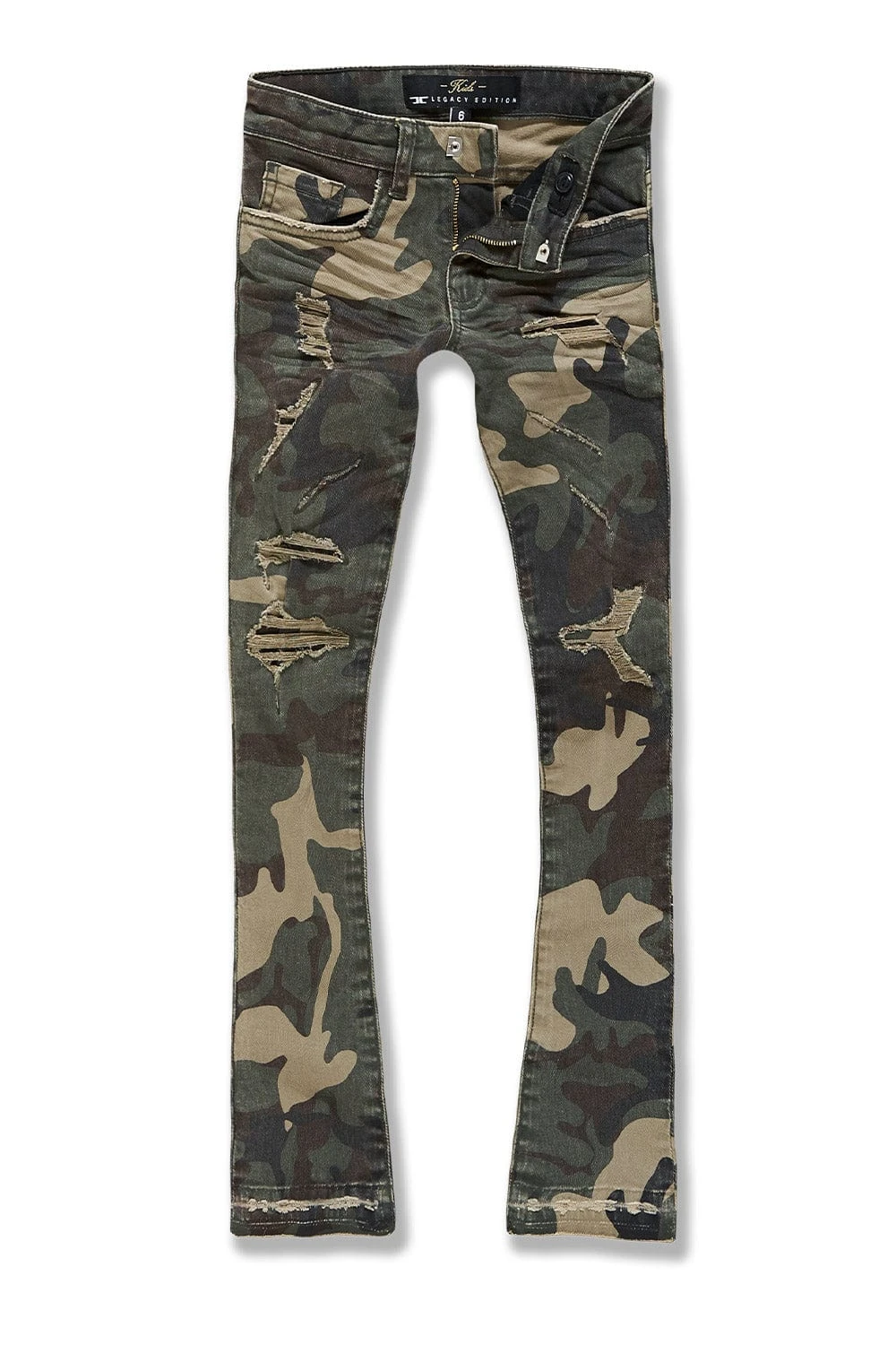RJ is wearing our Kids Stacked Tribeca Twill Pants (Woodland) in size 7.