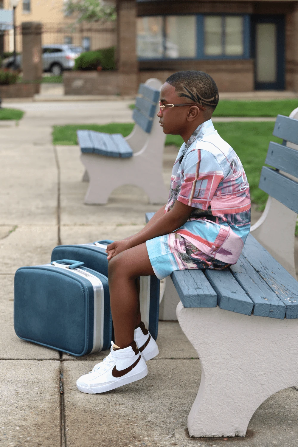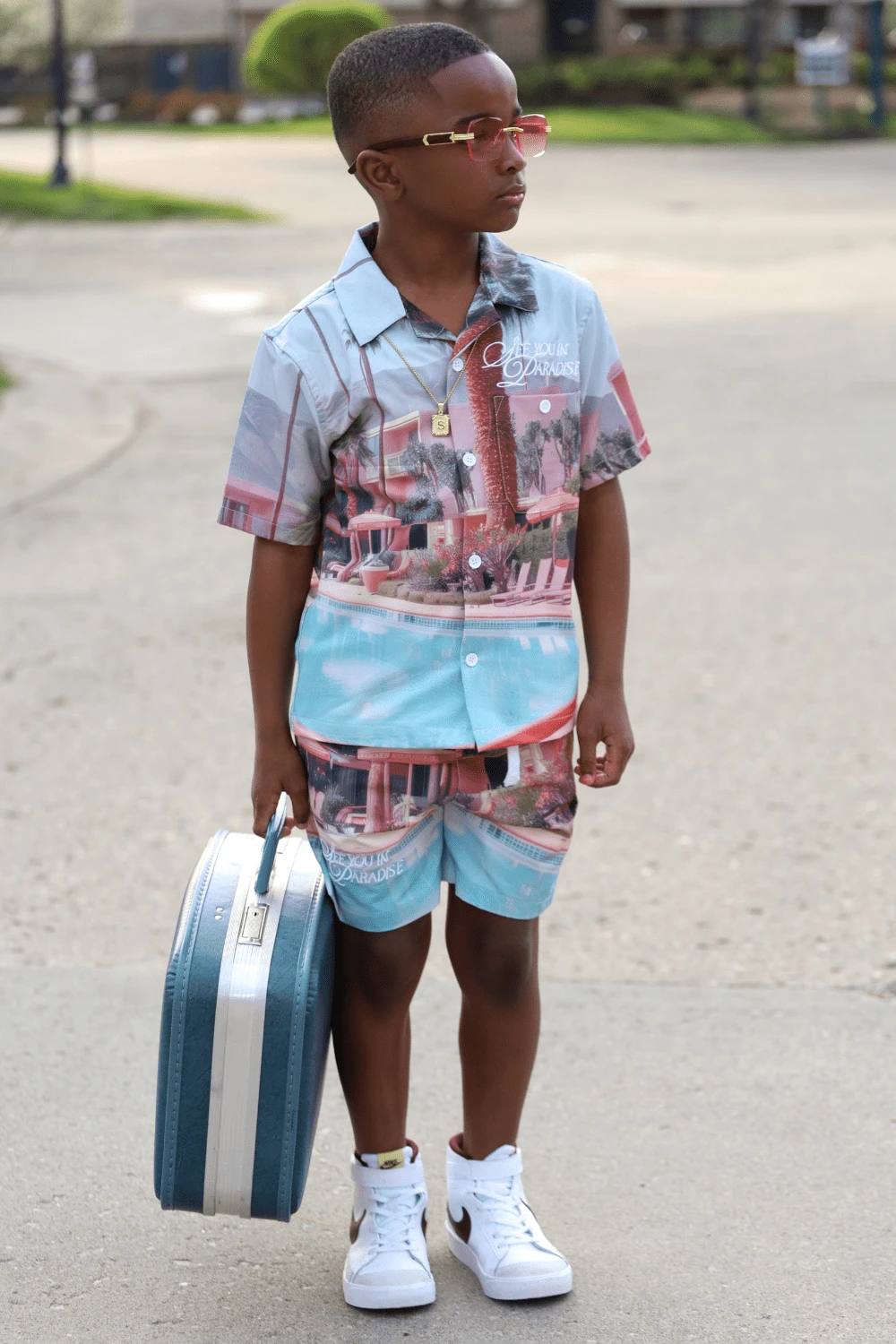 *Zeke is wearing our Kids Wanderlust Party Shorts (Sunset) in Size 8.