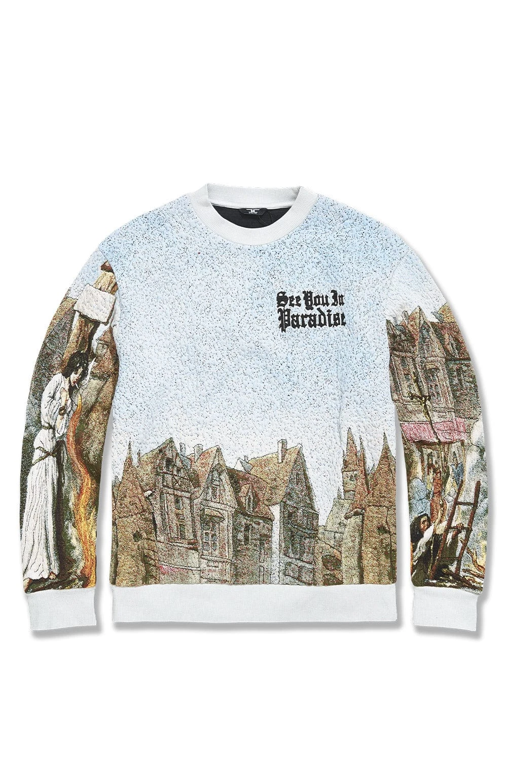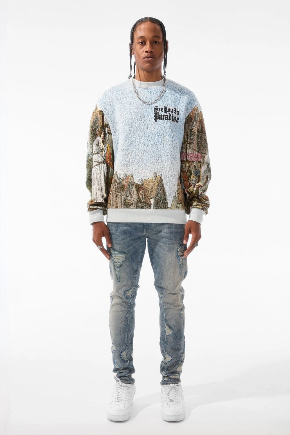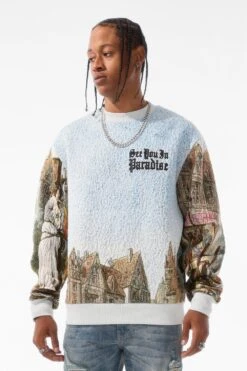 *Cozy is 6’1″ and weighs 170 lbs. He is wearing our Martyr Crewneck Sweater (Size Large) in Light Blue