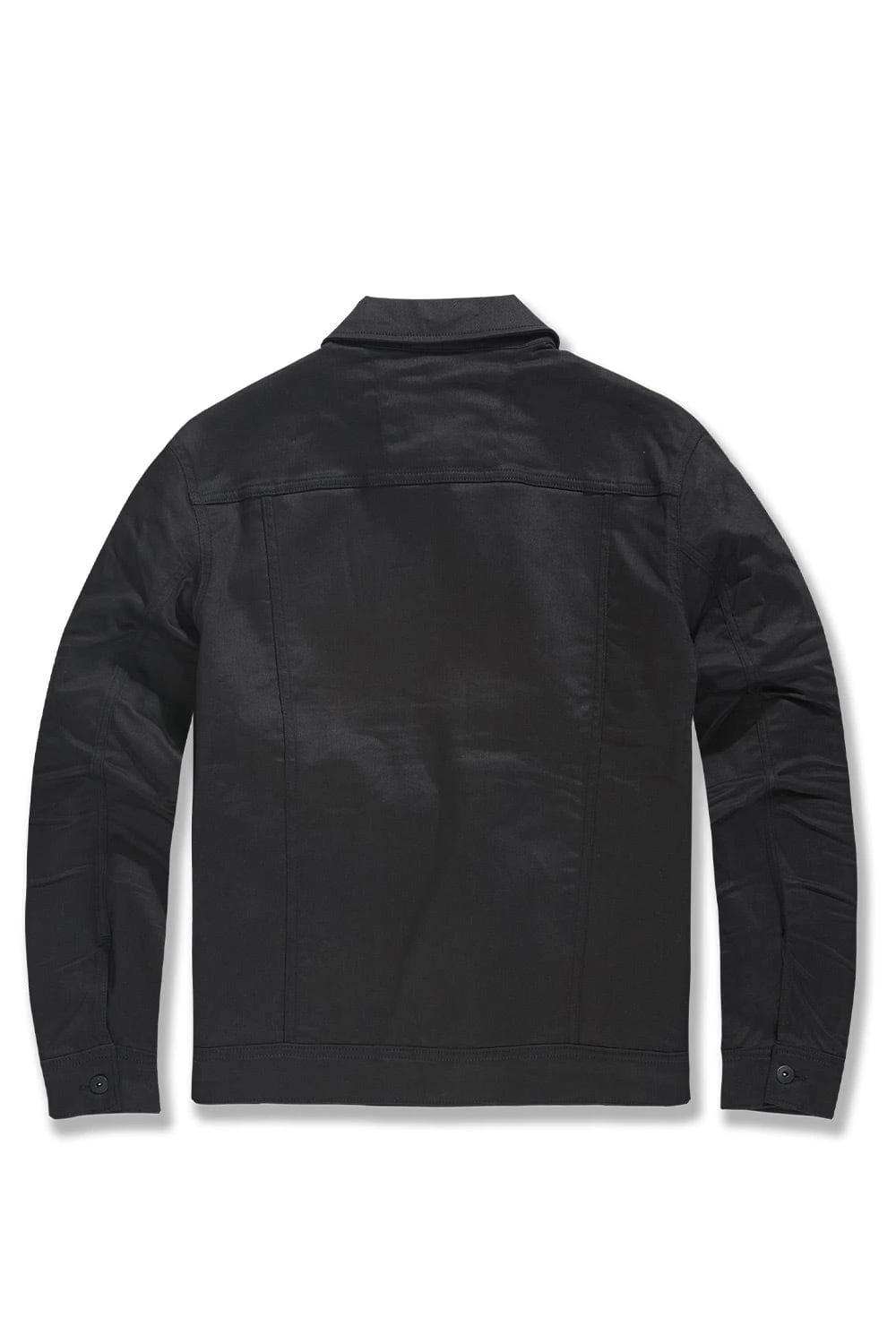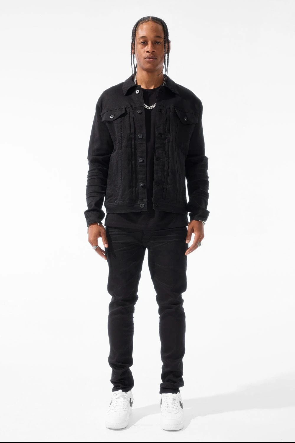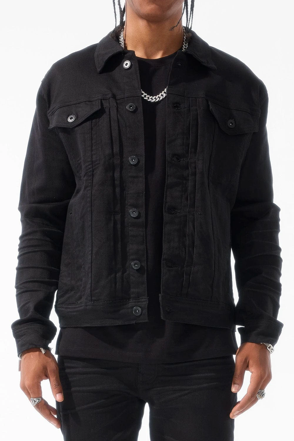 *Cozy is 6’1″ and weighs 170 lbs. He is wearing our Obsidian Denim Trucker Jacket (Size Large) in Black