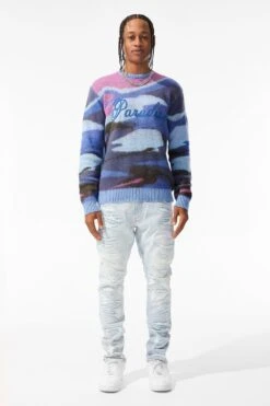 *Cozy is 6’1″ and weighs 170 lbs. He is wearing our Paradise Mirage Crewneck Sweater (Size Large) in Blue