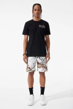 *Cozy is 6’1″ and weighs 170 lbs. He is wearing our Retro – Into The Wild Shorts (Size Medium) in Snow Camo