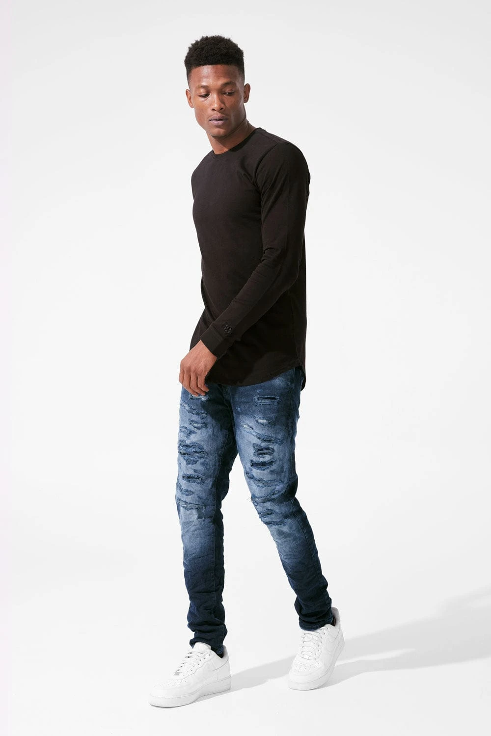 *Brandon is 6’2″ and weighs 180 lbs. He is wearing our Sean – High Point Denim (32″) in Midnight Blue