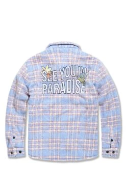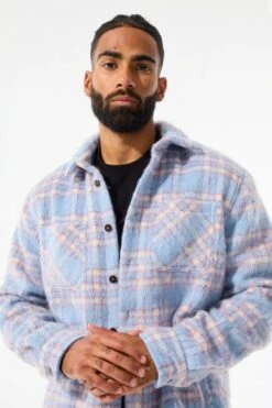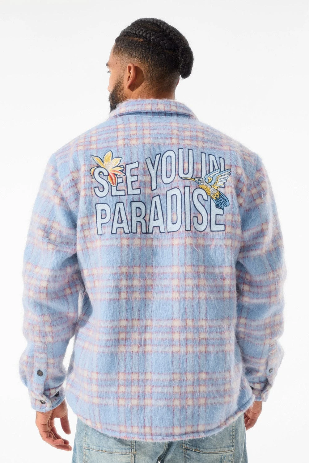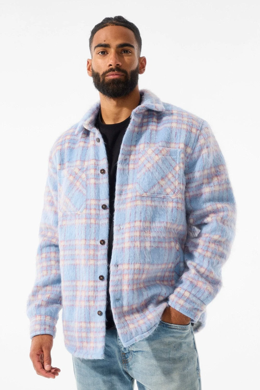 *Shomari is 6’1″ and weighs 175 lbs. He is wearing our See You In Paradise Flannel Shacket (Size Large) in Sky Blue