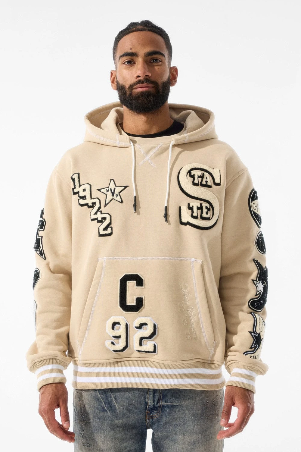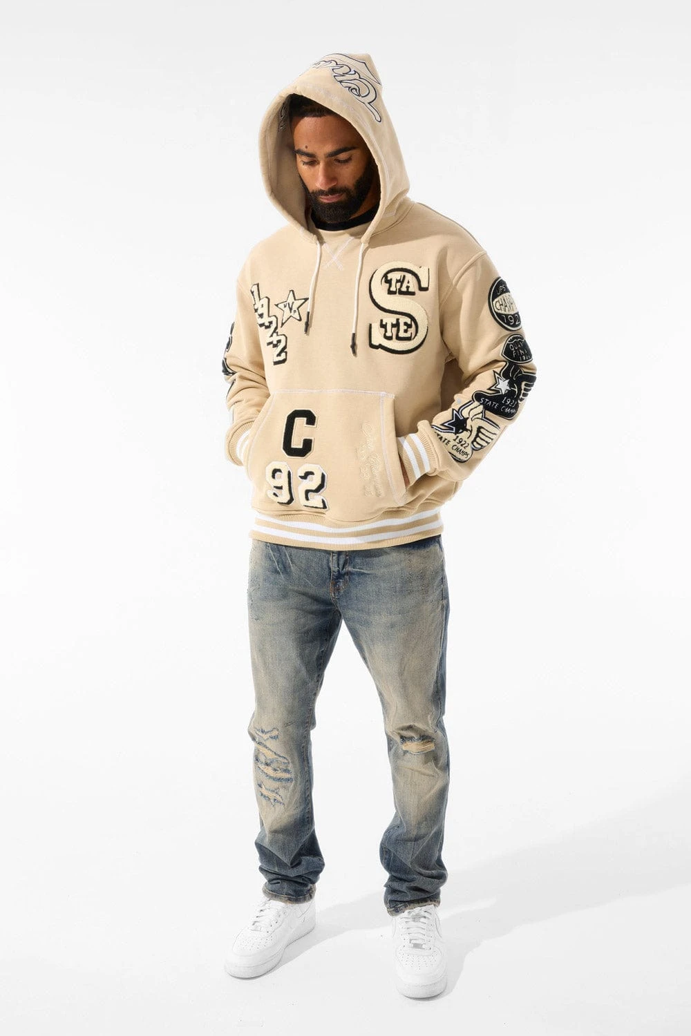 *Shomari is 6’1″ and weighs 175 lbs. He is wearing our State Champs Pullover Hoodie (Size Large) in Vintage Khaki