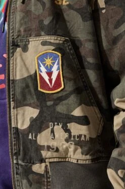 - Decorative patches and prints throughout